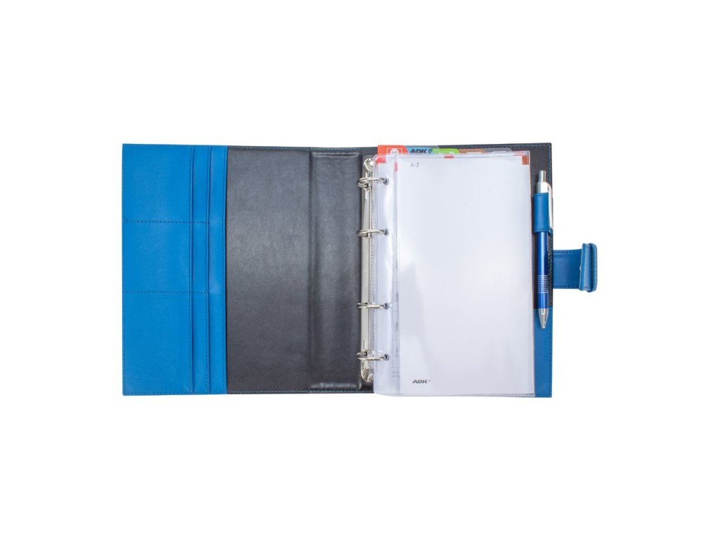 Cenově výhodný plánovací systém Manager od ADK formátu A5. Desky moderního vzhledu modré barvy v kombinaci dvou materiálů - high-tech nylonové látky z vnějšku a svěží italské imitace kůže zevnitř. Vysoce odolný materiál i do těch nejnáročnějších pracovních podmínek. Kroužková mechanika pro snadnou výměnu nebo doplnění formulářů, bezpečné a jednoduché zapínání na patentku a praktické vnitřní uspořádání, dělá z diáře skvělého pomocníka pro organizaci každého dne. Výška mechaniky je 3 cm. Rozměry desek diáře jsou 23 x 17,5 cm. Rozměry formulářů jsou 21 x 13 cm. Diář je dodáván včetně sady pro týdenní plánování, kuličkové tužky ADK, dělících listů a pravítka.Doplňkové parametry