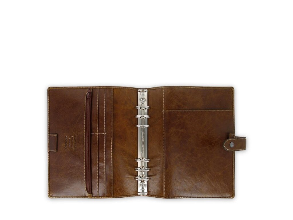 Kožený diář tradičního vzhledu z jemné bizoní kůže s kontrastním prošíváním v oříškově hnědém provedení. Diář má množství úložných prostor. Velikost náplně A5 - formát papíru 148 x 210 mm. Vlastnosti: - Kroužková mechanika: 6 kroužků, průměr 25 mm. - Levá vnitřní strana desek: 4 vertikální přihrádky na kreditní karty, pod nimi jedna otevřená vertikální kapsa po celé délce, 1 kapsa na zip. - Pravá vnitřní strana desek: : Kapsa na poznámkový blok, pod ní otevřená vertikální kapsa. Poutko na pero. Náplň: kalendář týden na dvě strany pravítko / záložka krajové výřezy nezapomeň papír bílý papíry barevné adresář možné odchylky ve složení náplněDoplňkové parametry