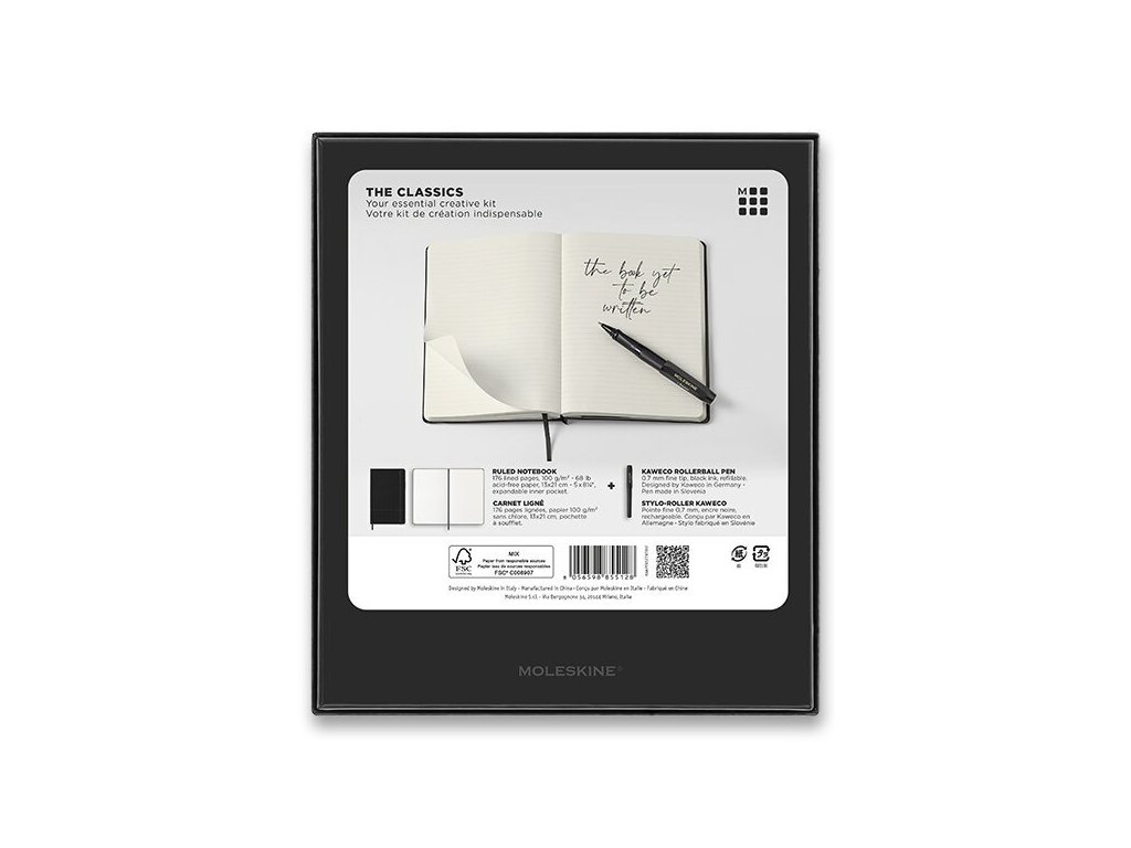 Sada linkovaného zápisníku Moleskine a keramického pera Kaweco v dárkové krabičce. Keramické pero Kaweco má tělo z ABS plastu v černé barvě, ergonomický úchop ve tvaru trojhranu pro pohodlnější psaní a vysoce kvalitní hrot šíře 0,7 mm. V balení jedna náplň. Zápisník Moleskine má pevnou vazbu v kartonových deskách, ve hřbetu šitou. Pružná páska proti samovolnému otevírání. Zápisník má kapsu na vizitky a drobnosti, která je vyrobená z tkaniny a kartonu, textilní záložku a leták s historií značky Moleskine. Rozměrově je zápisník ve velikosti L - A5 (13 x 21 cm) a obsahuje 120 linkovaných listů. Gramáž papíru je 70 g/m2, papír neobsahuje kyseliny.Doplňkové parametry