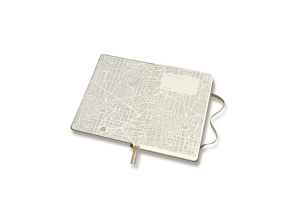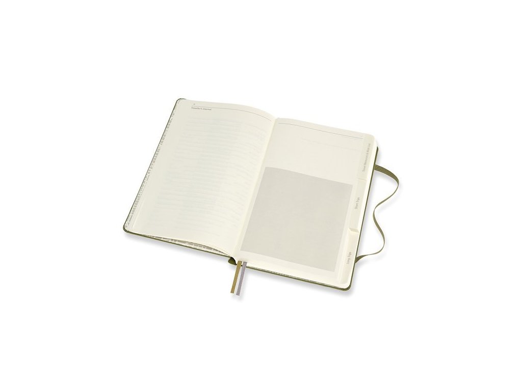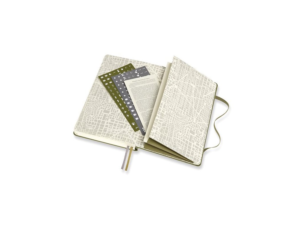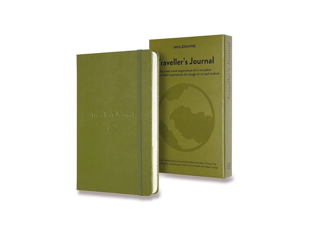 Zápisník Moleskine pro zaznamenávání cestovatelských zážitků. S šitou vazbou a s pevnými deskami v barvě khaki s reliéfním zdobením. Obepíná ho pružná zelená páska proti samovolnému otevírání. Zápisník je vybaven 2 textilními záložkami, dvojitou vnitřní kapsou a barevnými samolepkami. Zápísník je v anglickém jazyce. Je rozdělen do 3 tématických sekcí se specifickým rozvržením stran (cestovatelské vzpomínky a plány, krátkodobé cestování až na 20 výletů, dlouhodobé cestování až na 6 výletů) a nechybí sekce pro vytvoření vlastních cestovatelských poznámek. Dále obsahuje mapu časových pásem, kalendář na 8 let, cestovatelské informace, plánování cest a rozpočtu i prázdné strany. Rozměrově je zápisník ve velikosti A5 (13 x 21 cm). Gramáž papíru je 70 g/m2, papír neobsahuje kyseliny. Dodáváno v kartonové dárkové krabičce.Doplňkové parametry