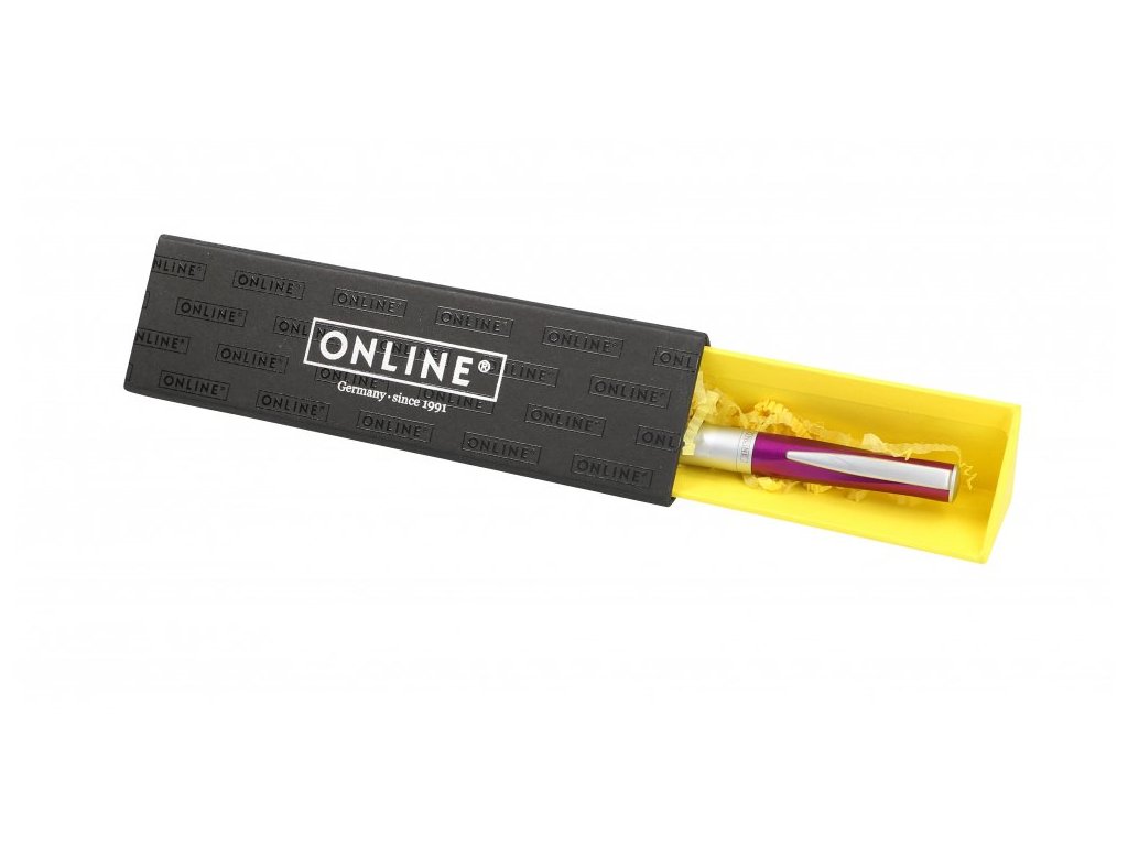 Moderní plnicí pero Online Squeeze má hliníkové tělo v matném provedení a víčko ve filalové barvě. Víčko je nasazovací a má originální zakřivení typické pro tuto řadu. Hliníkový klip je také matný. Pouze hrot M. Součástí balení bombička. Dodáváno v papírové trojúhelníkové krabičce.Doplňkové parametry
