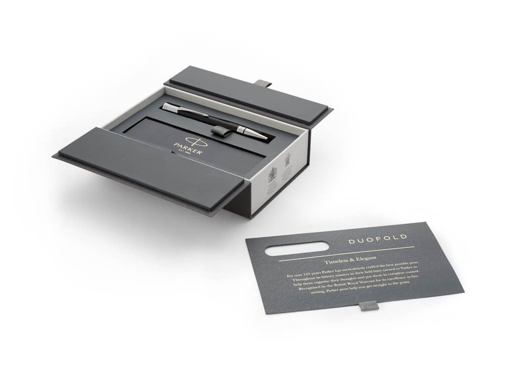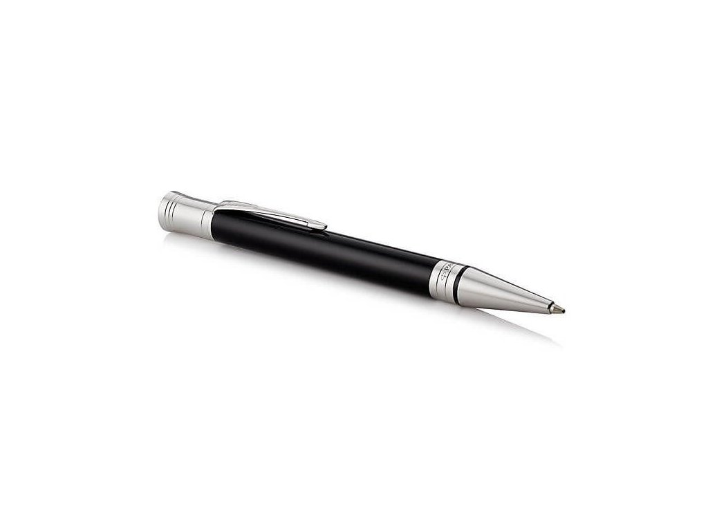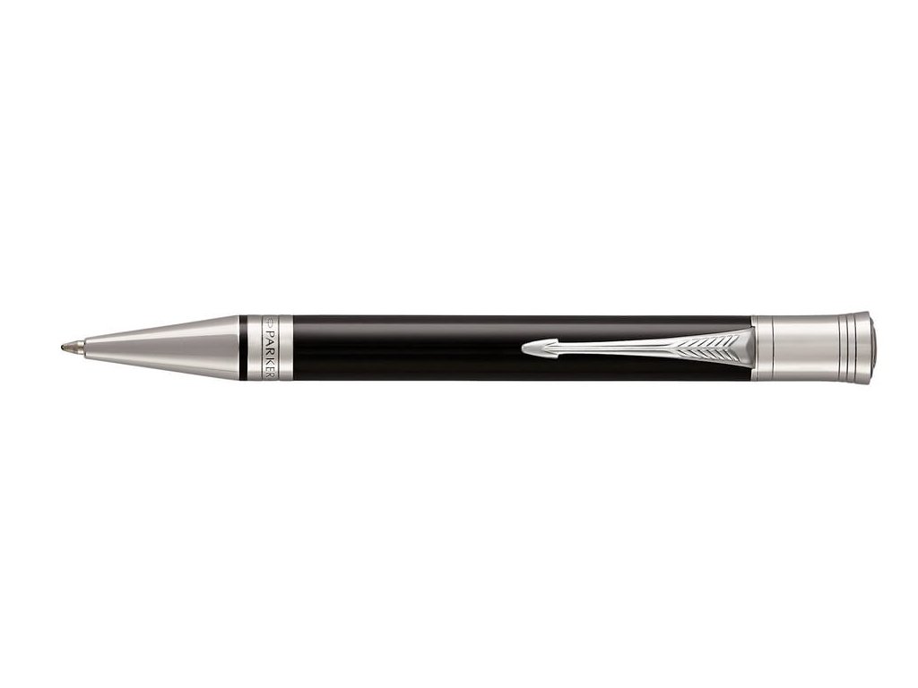Kuličkové pero Parker Duofold Black CT je vyrobené z houževnaté, sametově černé pryskyřice. Doplňky jsou pokovené palladiem. Otočný mechanismus pro vysunutí velkokapacitní náplně. Dodáváno s černou náplní. Včetně individuálního sériového čísla. Dodáváno v elegantní dárkové krabičce. Vyrobeno ve Francii.Doplňkové parametry