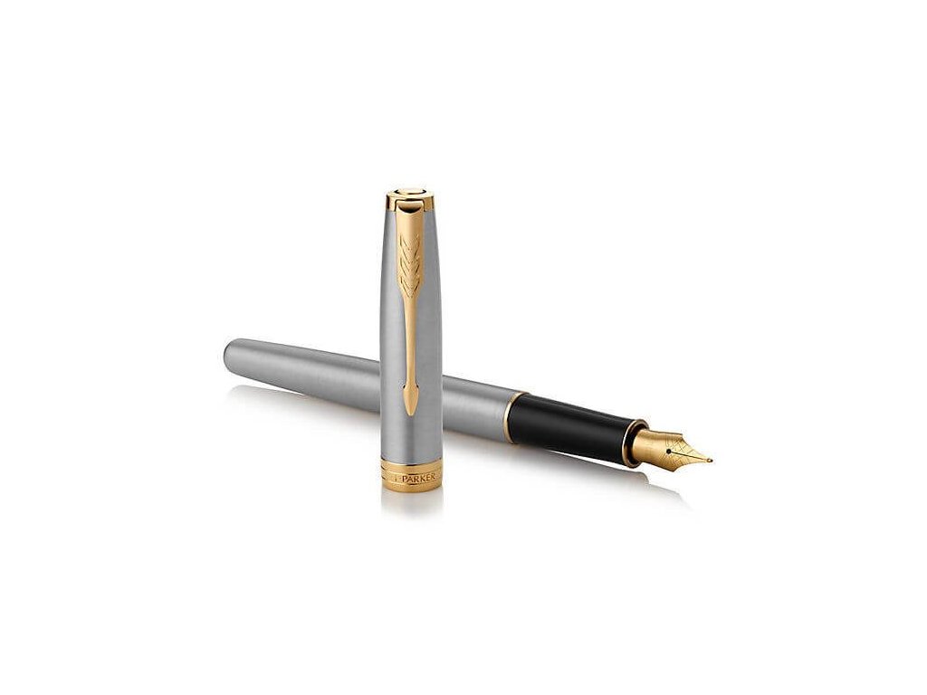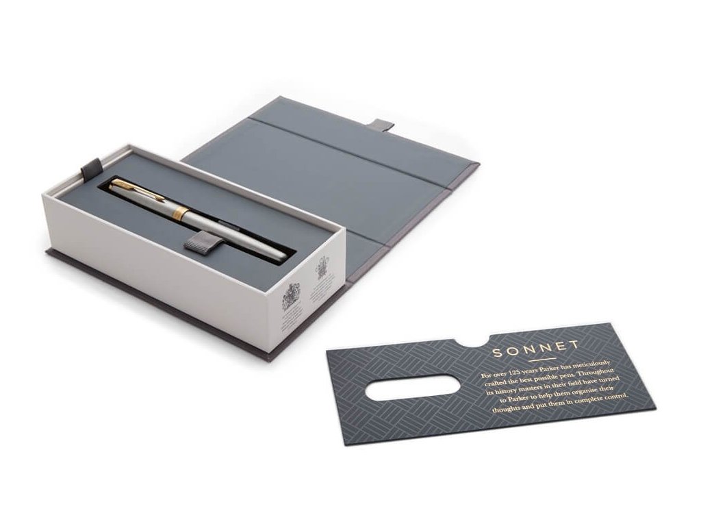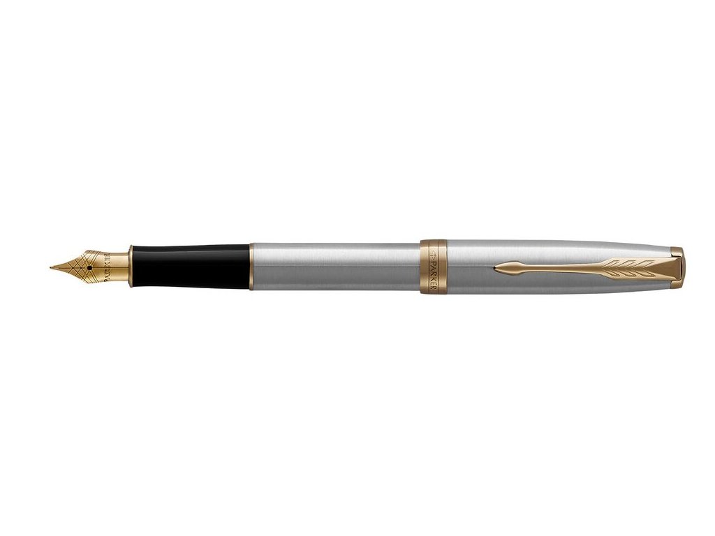 Plnicí pero Parker Royal Sonnet Stainless Steel GT má tělo a víčko vyrobené z broušené nerezové ocele. Doplňky jsou pokovené zlatem. Hrot z nerezové oceli s křížovou rytinou je pokovený 23karátovým zlatem. Víčko je nasazovací. Pero je vybavené systémem na bombičky i na plnění konvertorem. Standartně jsou v balení 2 černé bombičky a konvertor standart. Dodáváno v elegantní dárkové krabičce Parker. Nutno zvolit hrot: F – slabý – mírným tlakem vytváří jemnou stopu, je oblíbený hlavně u žen M – střední – průměrný tlak a šíře stopy při psaní, vhodný pro většinu uživatelů Hroty EF (extra slabé), B (široké) jsou dostupné na zakázku.Doplňkové parametry