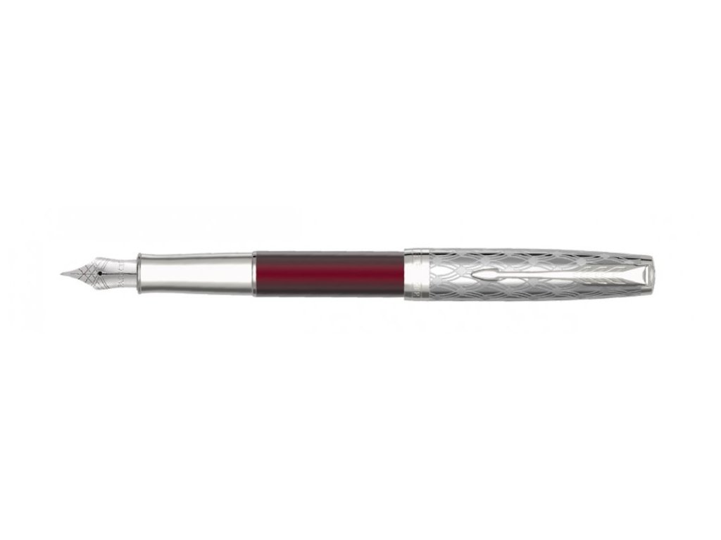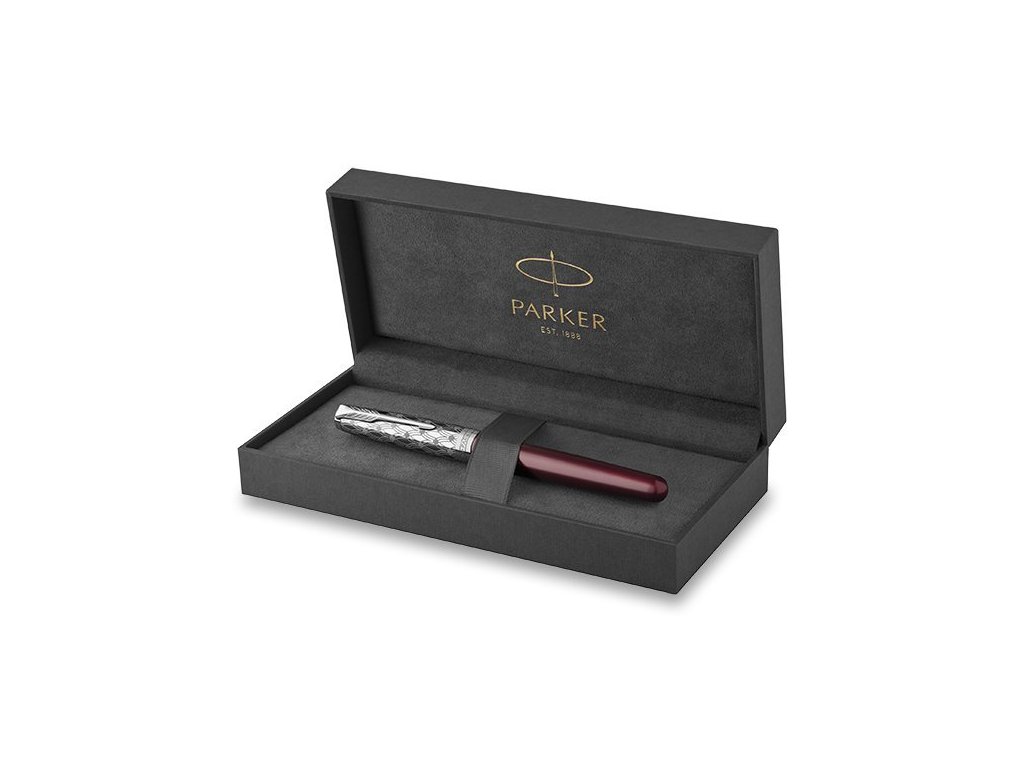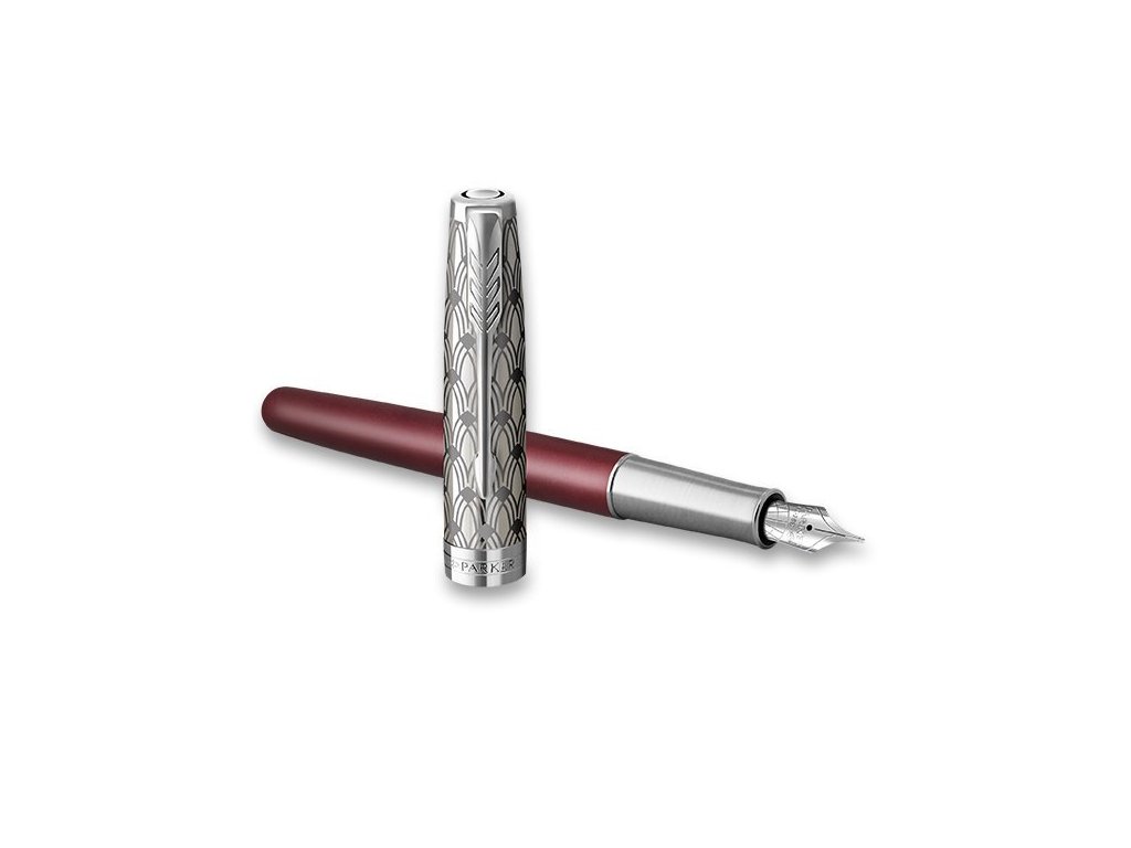 Řada Parker Sonnet je nadčasová a přitom vždy aktuální. Ideální rozložení hmotnosti pera a elegantně zaoblený tvar. Pero je pečlivě sestavené ze 17ti jednotlivých dílů. Plnicí pero Parker Sonnet Premium Metal Red CT vyniká svojí nadčasovou elegancí. Stylový design kombinovaný s jemnou řemeslnou prací. Tělo pera je vínově lakované. Víčko z leštěné nerezové oceli má zdobný vzor vytvořený leptáním. Doplňky pokovené nikl-palladiem. Hrot z 18karátového zlata (750/1000) má křížovou rytinu a je pokovený rhodiem. Nadstandardní nabídka hrotů na vyžádání. Víčko je nasazovací. Pero je vybavené systémem na bombičky i na plnění konvertorem. Součástí balení je standardní konvertor s pístem pro plnění inkoustu z lahvičky a 2 černé bombičky. Dodáváno v elegantní dárkové kazetě. Nutno zvolit hrot: F – slabý – mírným tlakem vytváří jemnou stopu, je oblíbený hlavně u žen M – střední – průměrný tlak a šíře stopy při psaní, vhodný pro většinu uživatelů Hroty EF (extra slabé), B (široké) jsou dostupné na zakázku.Doplňkové parametry