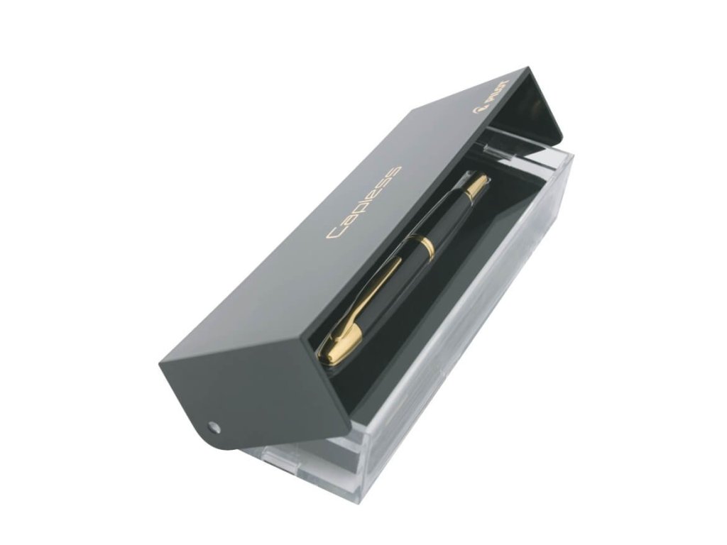 Kvalitní plnicí pero v elegantním designu v modré barvě se s stříbrnými elementy a s doplňky pokovenými rhodiem. Oproti ostatním modelům Capless je užší a lehčí. Pero je unikátní svým vysunovacím hrotem z 18 karátového zlata pokoveným rhodiem. Hrot se vysouvá tlačítkovým mechanismem. Zatažený hrot uzavírá klapka uvnitř odšroubovatelného dílu s klipem, která zabraňuje vysychání inkoustu a vnikání prachu do pera. Klip navíc vymezuje správné držení pera při psaní. Pero nemá víčko - není díky své konstrukci potřeba. Plnicí pero Capless je vybavené systémem na bombičky i na konvertor, který je součástí balení. Dodáváno v luxusní dárkové krabičce. Nutno zvolit hrot: F – slabý – mírným tlakem vytváří jemnou stopu, je oblíbený hlavně u žen M – střední – průměrný tlak a šíře stopy při psaní, vhodný pro většinu uživatelů B – široký – větší oblý hrot pro širokou psací stopu a větší tlakDiskuze