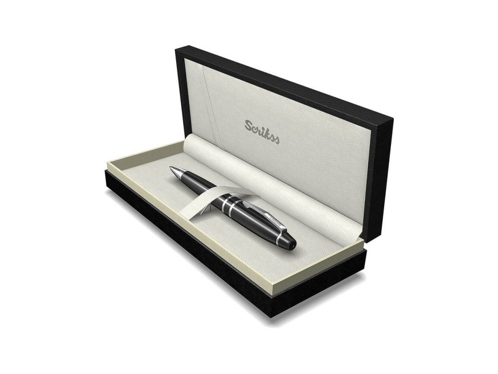 Masivní kuličkové pero Scrikss Havana v černé lakové úpravě s dvěma pochromovanými kroužky na vrchní části. Netradičně zalomený klip a doplňky jsou také pochromované. Otočný mechanismus pro vysunutí náplně. Dodáváno v dárkové krabičce.Doplňkové parametry