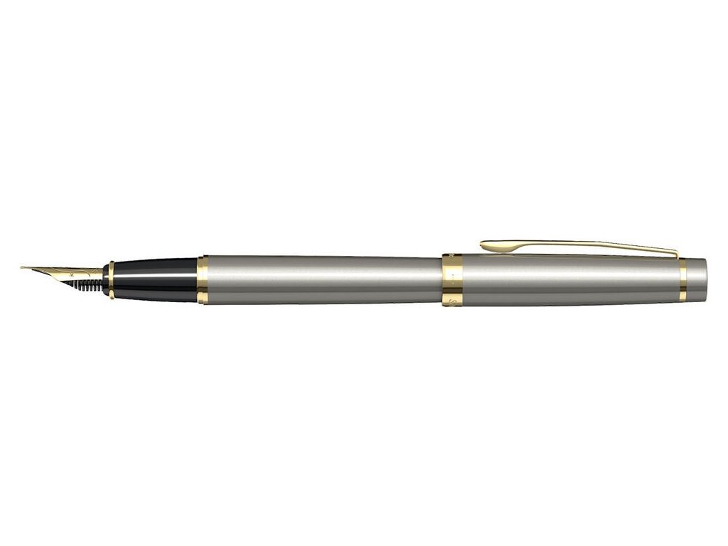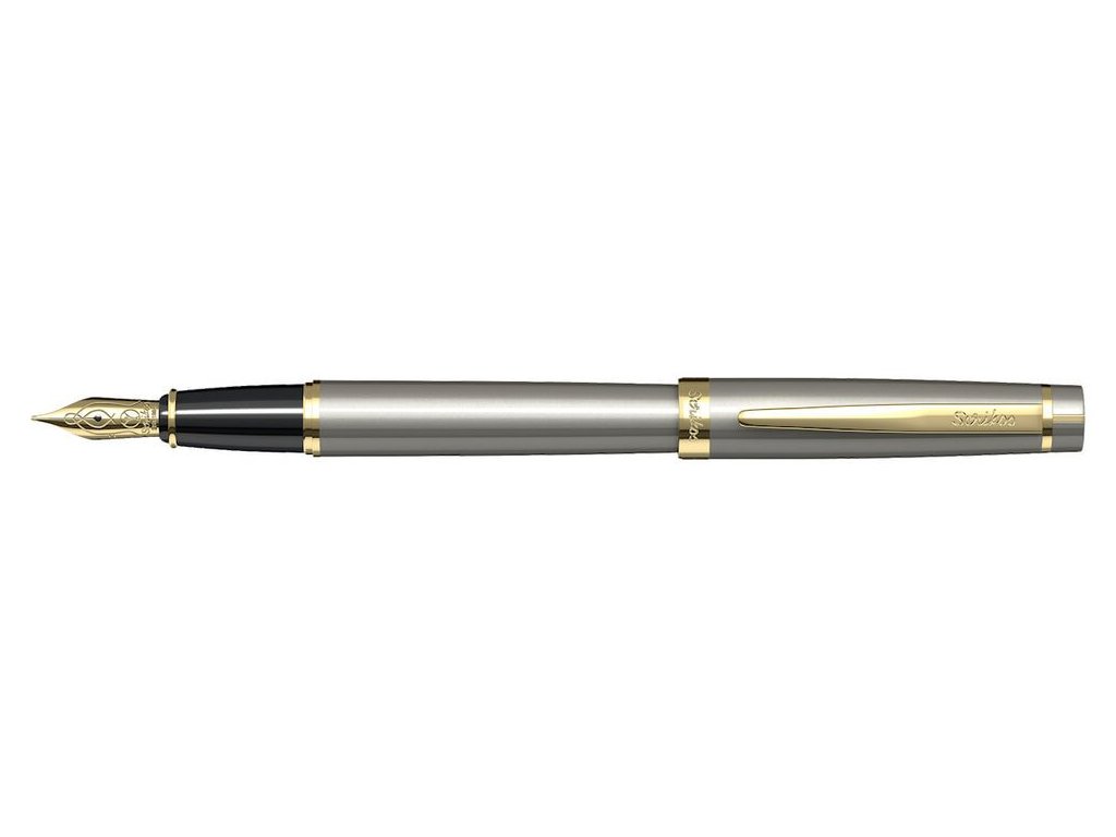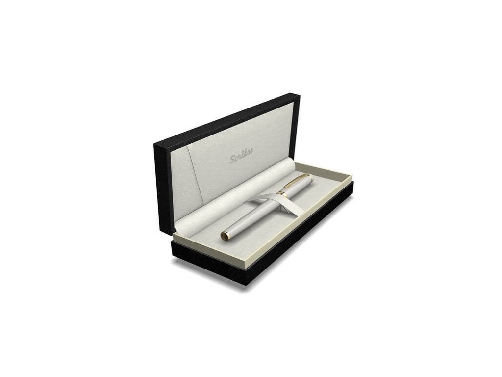 Plnicí pero Scrikss s mosazným tělem lakovaným několika vrstvami saténově stříbrného laku. Doplňky jsou pozlacené 23 karátovým zlatem. Klip je také pozlacený. Pero má ideální vyvážení. Hrot s iridiovou špičkou je vyrobený z nerezové ocele, je pozlacený a je v nabídce pouze v šířce M - střední. Pero je vybavené systémem na bombičky i na plnění konvertorem. Součástí balení je konvertor a 2 modré bombičky. Dodáváno v dárkové krabičce.Doplňkové parametry