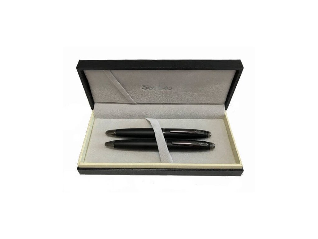 Elegantní dárková sada plnicího a kuličkového pera Knight v matně černém provedení s černěnými doplňky. Plnicí pero má nasazovací víčko. Součástí balení je také konvertor a 3 modré inkoustové bombičky. Kuličkové pero má otočný mechanismus pro vysunutí velkokapacitní náplně. Dodáváno v dárkové krabičce.Doplňkové parametry