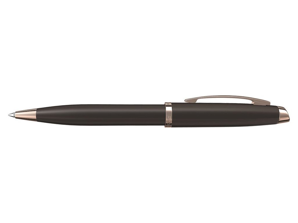 Kuličkové pero Scrikss s tělem v hnědé povrchové úpravě a s doplňky zdobenými 23 karátovým růžovým zlatem. Elegantní zkosený vršek víčka. Otočný mechanismus pro vysunutí velkokapacitní náplně. Dodáváno v dárkové krabičce.Doplňkové parametry