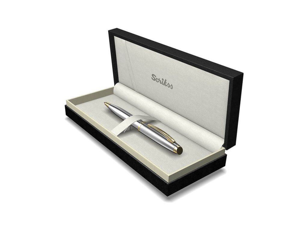 Kuličkové pero Scrikss s pochromovaným tělem a s pozlaceným klipem a doplňky. Vrchní část je jemně zdobená liniemi. Elegantní zkosený vršek víčka. Otočný mechanismus pro vysunutí velkokapacitní náplně. Dodáváno v dárkové krabičce. Scrikss je turecká značka specializující se na výrobu luxusních psacích potřeb a doplňků. Její historie sahá až k roku 1963.Doplňkové parametry