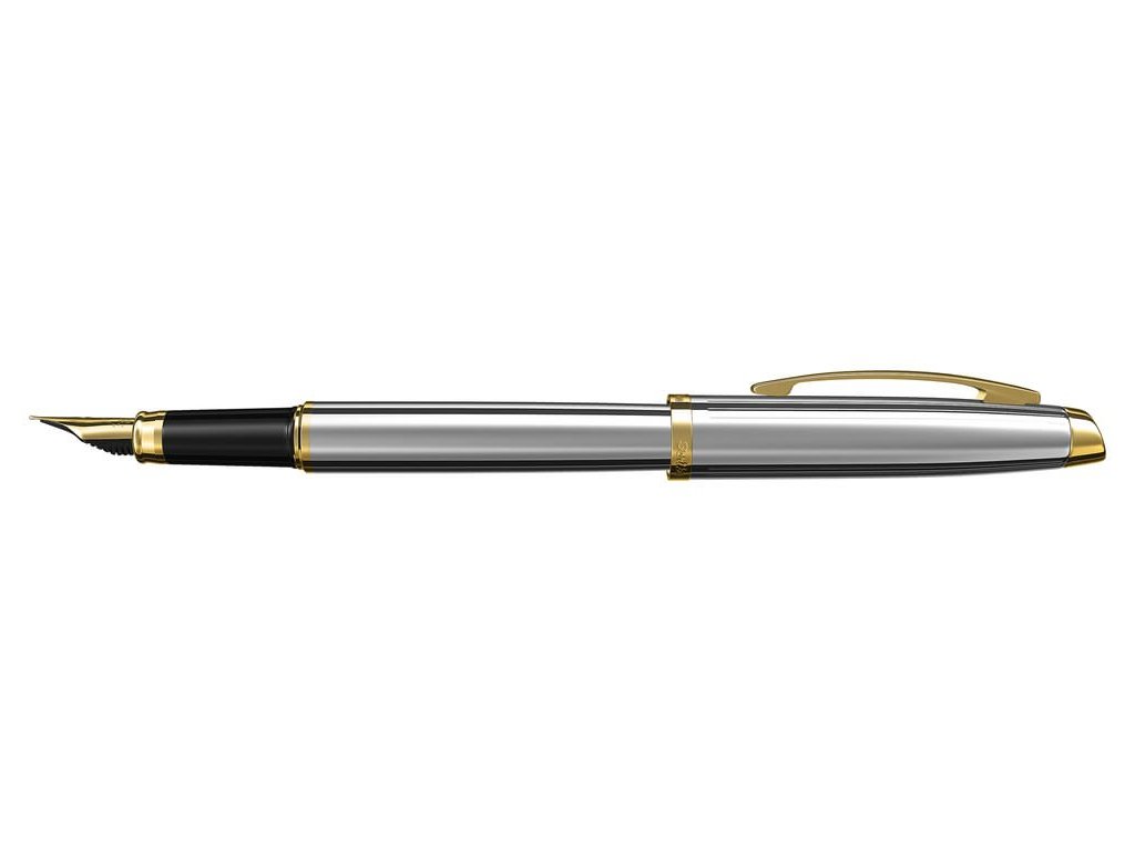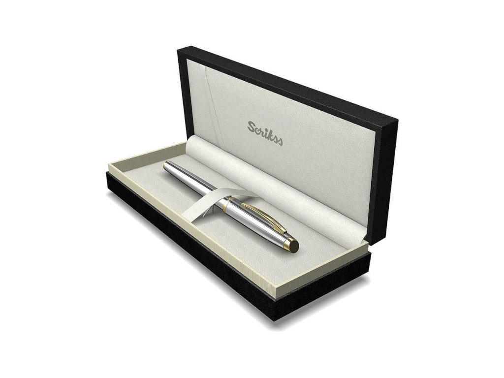 Plnicí pero Scrikss s pochromovaným tělem a s pozlaceným klipem a doplňky. Elegantně zkosené nasazovací víčko je jemně zdobené liniemi. Hrot s iridiovou špičkou je vyrobený z nerezové ocele, je pozlacený a je v nabídce pouze v šířce M - střední. Pero je vybavené systémem na bombičky i na plnění konvertorem. Součástí balení je konvertor a 2 modré bombičky. Dodáváno v dárkové krabičce. Scrikss je turecká značka specializující se na výrobu luxusních psacích potřeb a doplňků. Její historie sahá až k roku 1963.Doplňkové parametry