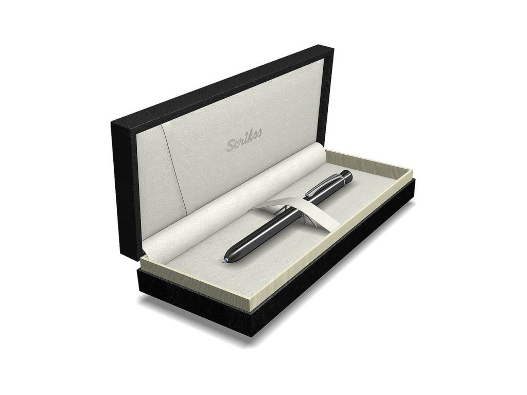 Značkové multifunkční pero 3v1 - modrá a červená kuličková tužka a mikrotužka 0,5 mm - výběr se provádí otáčením těla. Pryž je schovaná ve vrchním víčku. Tělo pera v černě lakové povrchové úpravě. Dodáváné v dárkové krabičce s logem výrobce. Scrikss je turecká značka specializující se na výrobu luxusních psacích potřeb a doplňků. Její historie sahá až k roku 1963.Doplňkové parametry