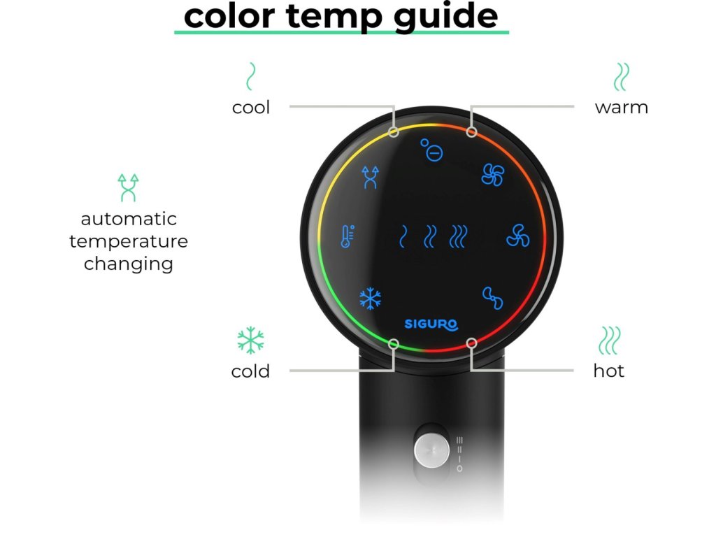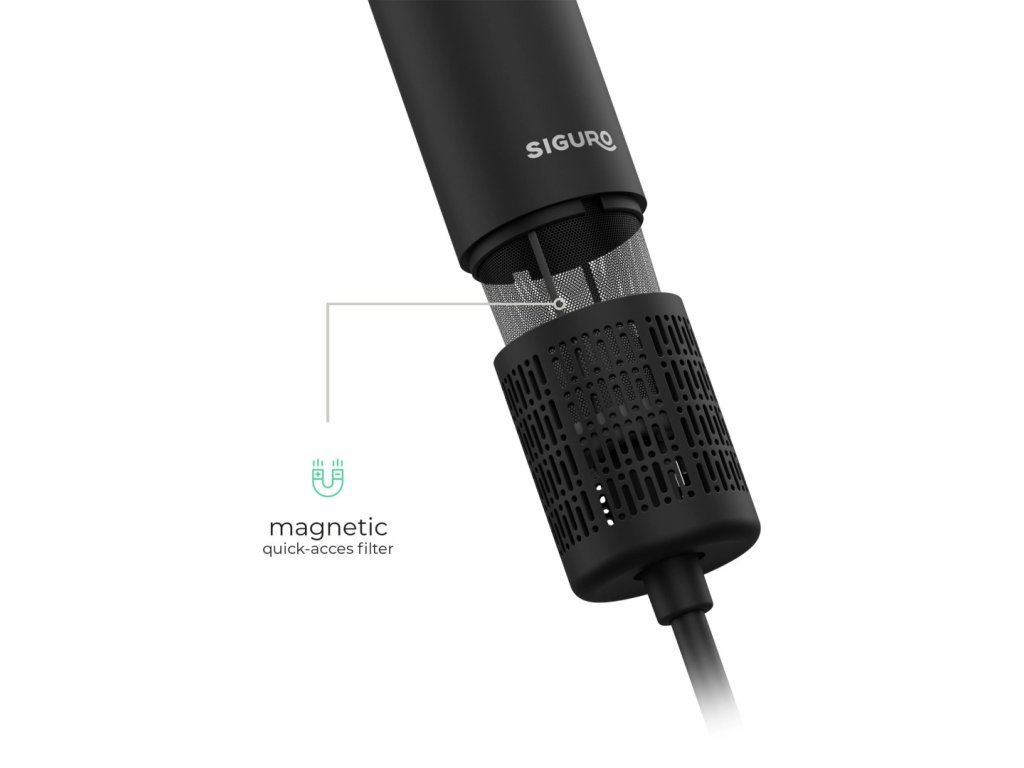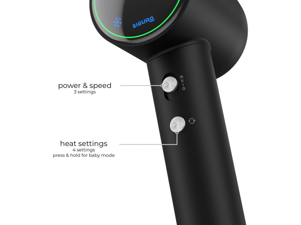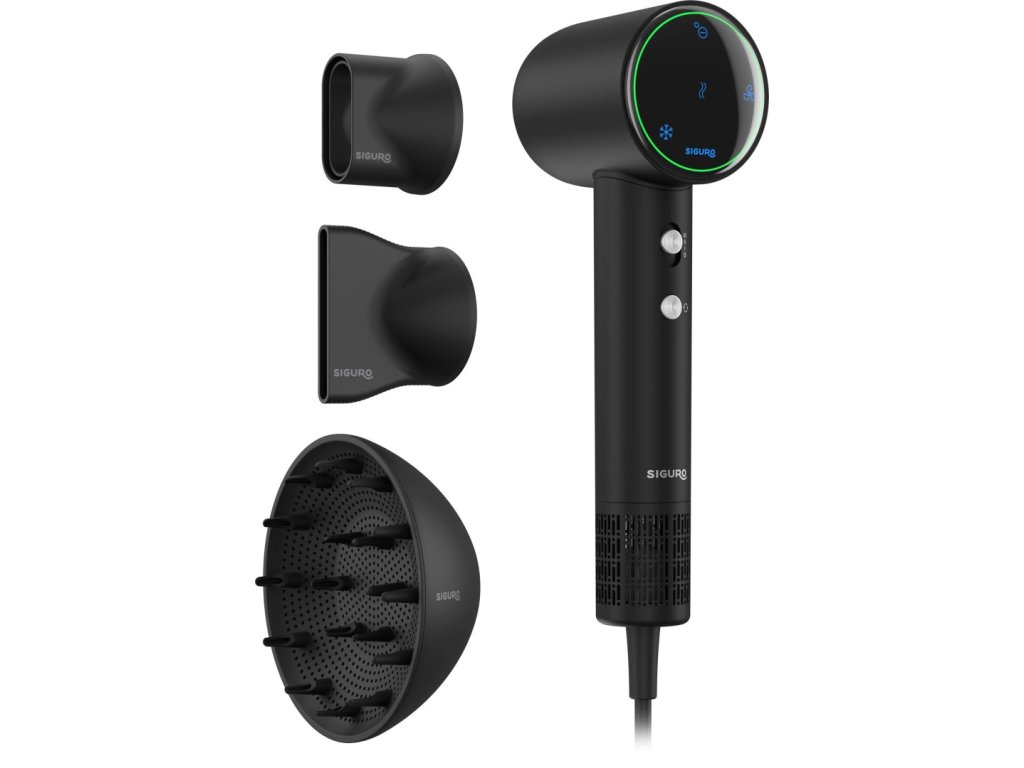 Fén na vlasy Siguro HR-I550B Twilight Flow PremiumS fénem na vlasy Siguro HR-I550B Twilight Flow Premium, který je vybavený celou řadou praktických funkcí, dosáhnete perfektních výsledků. Tento fén nabídne ionizátor, 4 teplotní stupně, 3 rychlosti proudění vzduchu, režim Baby Care, displej či odnímatelný magnetický filtr. Jistě oceníte tišší chod v porovnání s ostatními fény, odlehčené provedení a kompaktní rozměry, díky čemuž nezabere mnoho místa a fén si můžete bez problémů vzít s sebou na cesty. Součástí balení je magnetický držák na zeď a tři nástavce – koncentrátor, úzká stylingová hlavice a difuzér.Navržený pro rychlé a šetrné vysoušeníSiguro HR-I550B Twilight Flow Premium disponuje kvalitním bezkartáčovým (BLDC) motorem s výkonem 1 500 W a až 101 000 otáčkami vytváří silný proud vzduchu pro rychlé vysušení. Rychlost lze regulovat pomocí tlačítka na rukojeti ve 3 úrovních – nízká, střední a vysoká. Aktuálně nastavená rychlost je signalizována příslušnou ikonou na displeji.IonizátorGenerátor záporných...