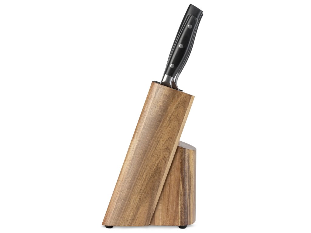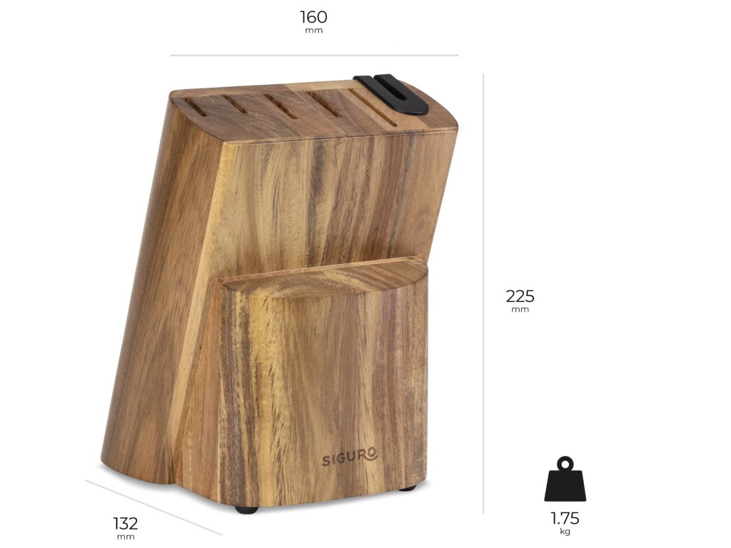 - Certifikovaný akáciový blok: Sada je dodávána s designovým blokem z certifikovaného akáciového dřeva, který nabízí bezpečné a praktické uložení nožů. Blok je vybaven protiskluzovými nožičkami pro větší stabilitu a integrovaným ostřičem pro snadnou údržbu.