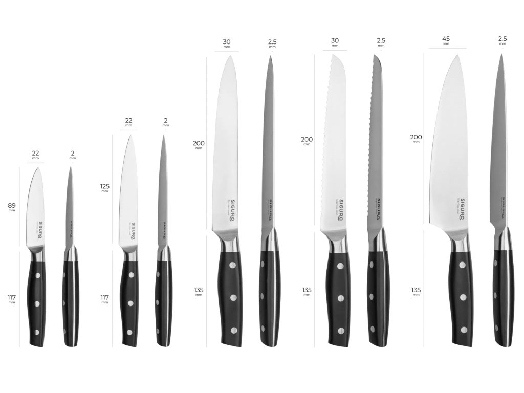 - Délka čepele: 8,9 cm (loupací), 12,5 cm (užitkový), 20 cm (krájecí, nůž na chleba, kuchařský)