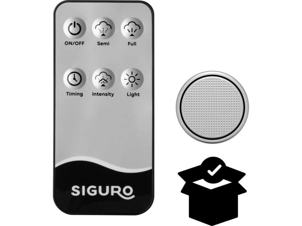 Použití aroma difuzéru Siguro AD-G400LW Silvery Blue je velmi snadné, stačí naplnit nádržku o objemu 400 ml vodou s esenciálním olejem a přístroj zapojit do elektrické sítě. Ovládání zajišťují dvě tlačítka. Pomocí tlačítka "MIST" nastavíte intenzitu a režim vypouštění páry – nepřetržitý chod či automatické vypnutí po jedné, třech nebo šesti hodinách. Tlačítko "LIGHT" poté slouží pro ovládání podsvícení, které je k dispozici v 7 různých barvách s možností úplného vypnutí. Pro ovládání difuzéru odkudkoliv můžete využít také dodávaný dálkový ovladač.