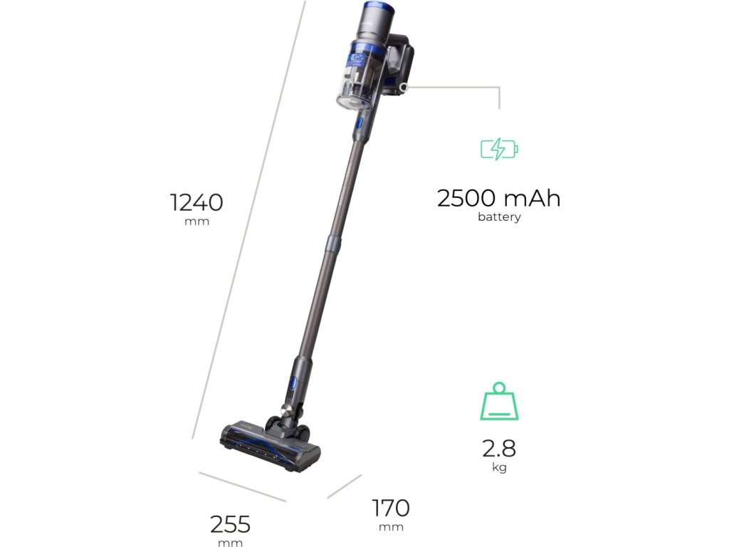 S tímto všestranným tyčovým vysavače budete moci současně vysávat i vytírat – součástí je totiž i mopovací nástavec, který lze jednoduše připnout na podlahovou hubici. Kromě toho lze jedním stiskem tlačítka z vysavače vyjmout teleskopickou trubici a používat jej jako kompaktní ruční vysavač pro přesný úklid auta či čalouněného nábytku. Siguro VT-H311B váží pouhých 2,8 kg, dále je vybavený výkonným BLDC motorem s dlouhou životností a v kombinaci s cyklónovou technologií poskytuje vysoký sací výkon až 85 AW. Díky vyměnitelné 25,9V Li-Ion baterii budete moci nepřetržitě vysávat až 60 minut. Trubice je teleskopická a její délku si můžete při vysávání vždy nastavit. Součástí balení je celá řada příslušenství – úklid domácnosti tak bude efektivní a rychlý.
