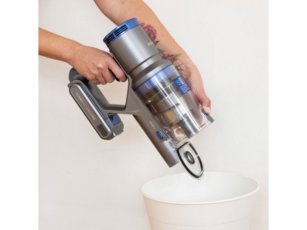Akumulátorový tyčový vysavač Siguro VT-H311B nemusí sloužit pouze k vysávání koberců či vytírání podlah. Kdykoliv budete potřebovat, jedním stisknutím můžete vyjmout trubici, čímž přístroj přeměníte na malý ruční vysavač ideální pro úklid pohovky, stolu nebo auta. Vyprázdnění odpadní nádoby už nemůže být jednodušší. Stačí vyjmout motorovou jednotku z trubice a nad odpadkovým košem stisknout tlačítko a uvolnit pojistku, čímž dojde k vyprázdnění nádoby, aniž byste ji museli vyndávat a složitě čistit.